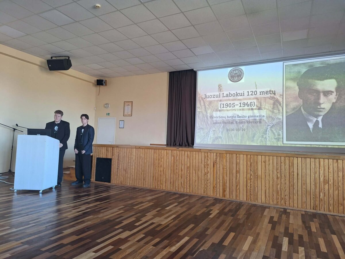 Klaipėdos rajono Veiviržėnų Jurgio Šaulio gimnazijos 9 klasės mokiniai Lukas Rumšas ir Emilijus Knyzeris, vadovaujami lietuvių kalbos ir literatūros mokytojos metodininkės Ramutės Stankuvienės, pristatė pranešimą, skirtą kalbininko Juozo Laboko 120-osioms gimimo metinėms. Šį įdomų pranešimą charizmatiškiems vyrukams padėjo parengti ir mokytoja ekspertė, muziejininkė Valdonija Karaliūnienė. Kiek dar daug nežinom apie savo kraštą, jo žmones. Kad J. Labokas kalbininkas, publicistas, daugelis žino, o kad patyrė enkavėdistų žiaurumus, kad... Gerai, kad kalbėję vyrukai priminė, jog Veiviržėnų Jurgio Šaulio gimnazijos muziejuje vyksta šiam iškiliam veiviržėniškiui skirta paroda - galima susipažinti plačiau.