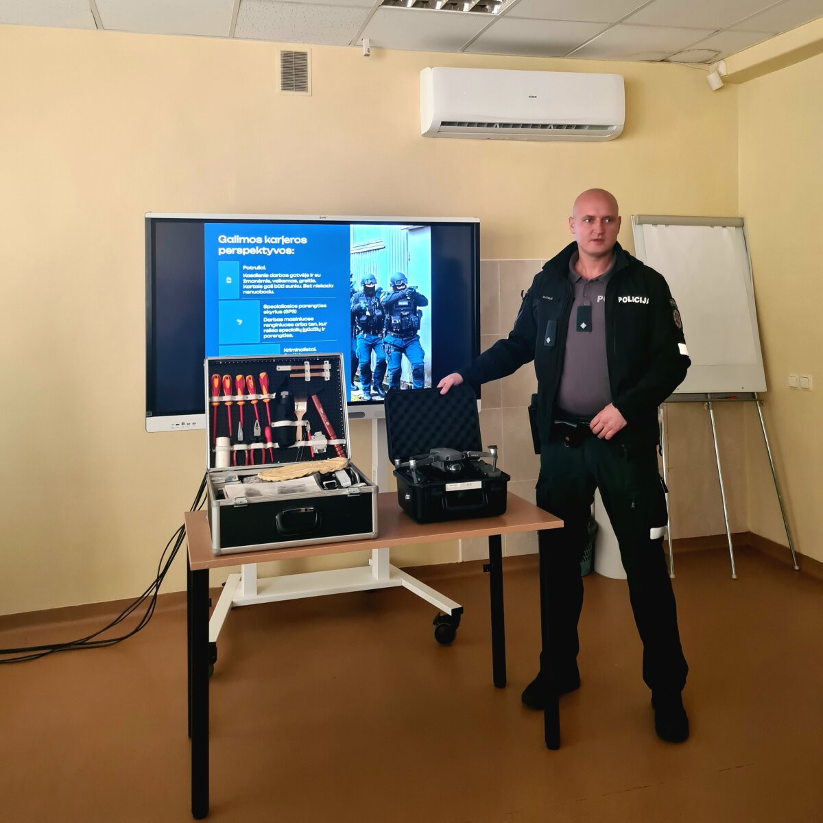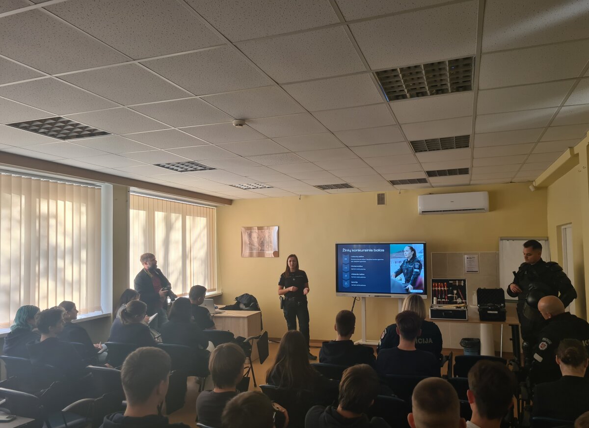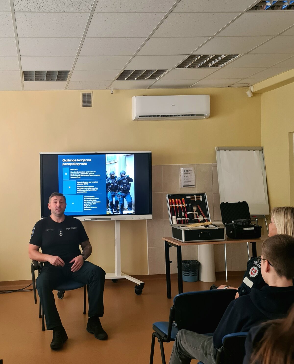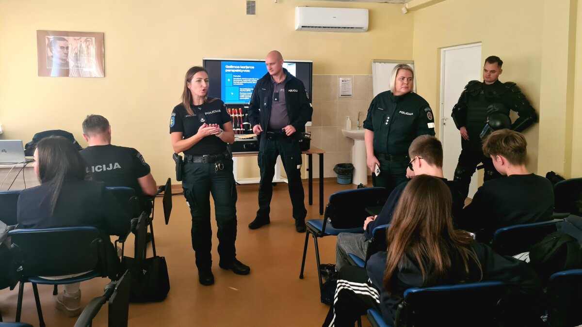 Vizito metu Viešosios tvarkos tarnybos Prevencijos skyriaus vyriausioji specialistė Aurelija Studencova, tyrėjai ir kiti pareigūnai gimnazistams papasakojo apie policijos darbo kasdienybę, pabrėžiant jo svarbą visuomenės saugumui. Ypatingas dėmesys skirtas pačiam profesijos įgijimo keliui: kaip tapti policininku, pristatyti reikalavimai stojantiems į policijos studijas. Aptarti atrankos niuansai: paaiškinta, kokios aplinkybės gali lemti nepatekimą į šias studijas, akcentuojant fizinio pasirengimo, teistumo nebuvimo ir sveikatos būklės svarbą.